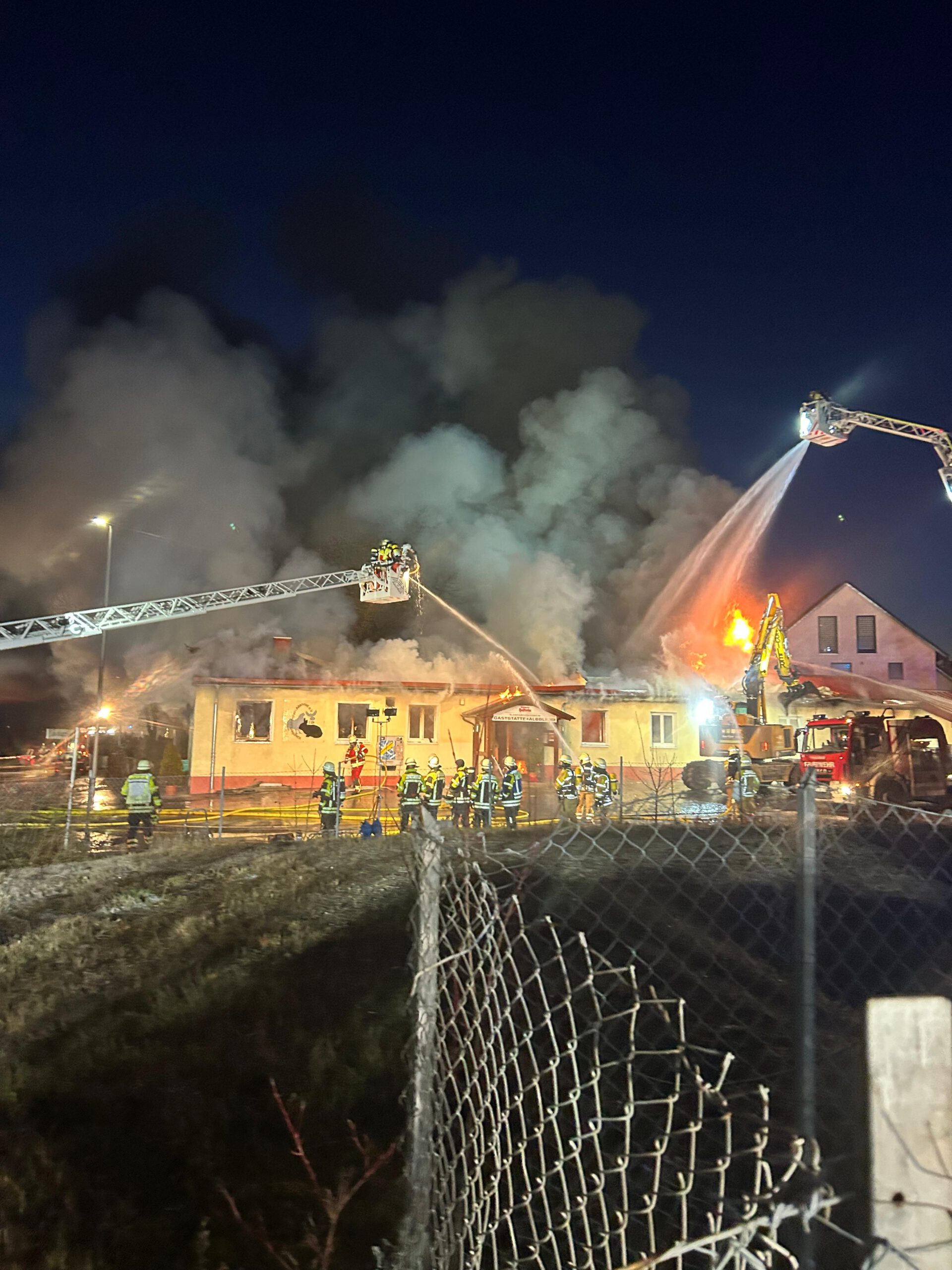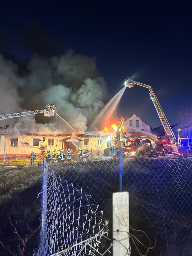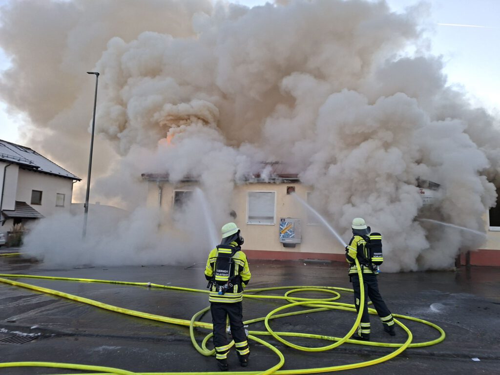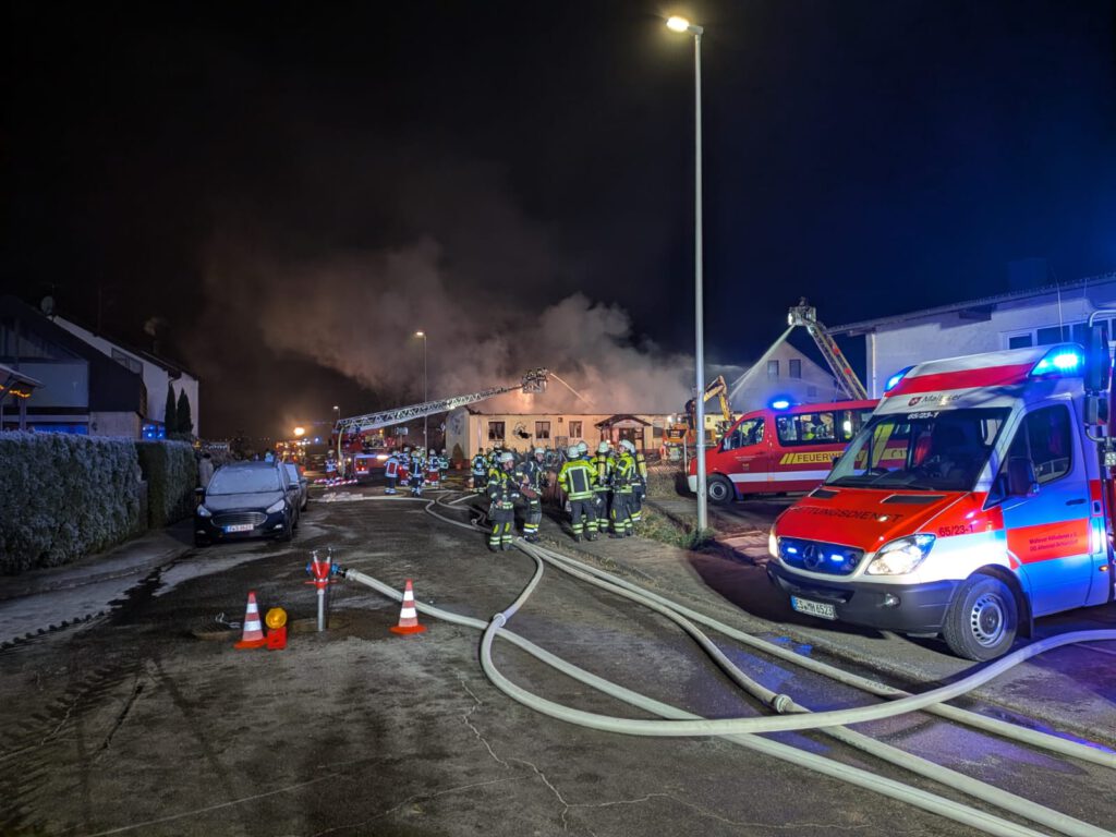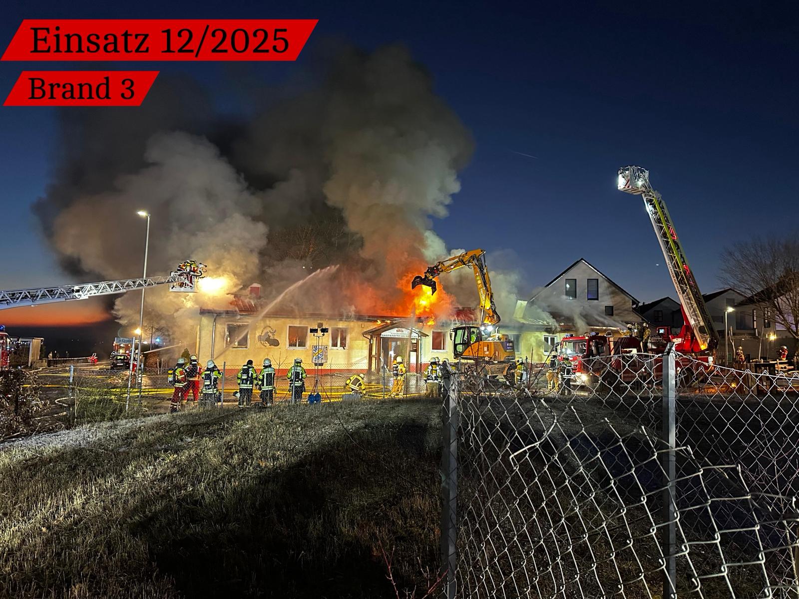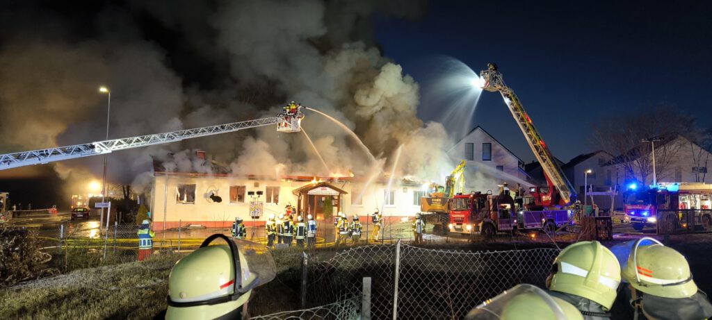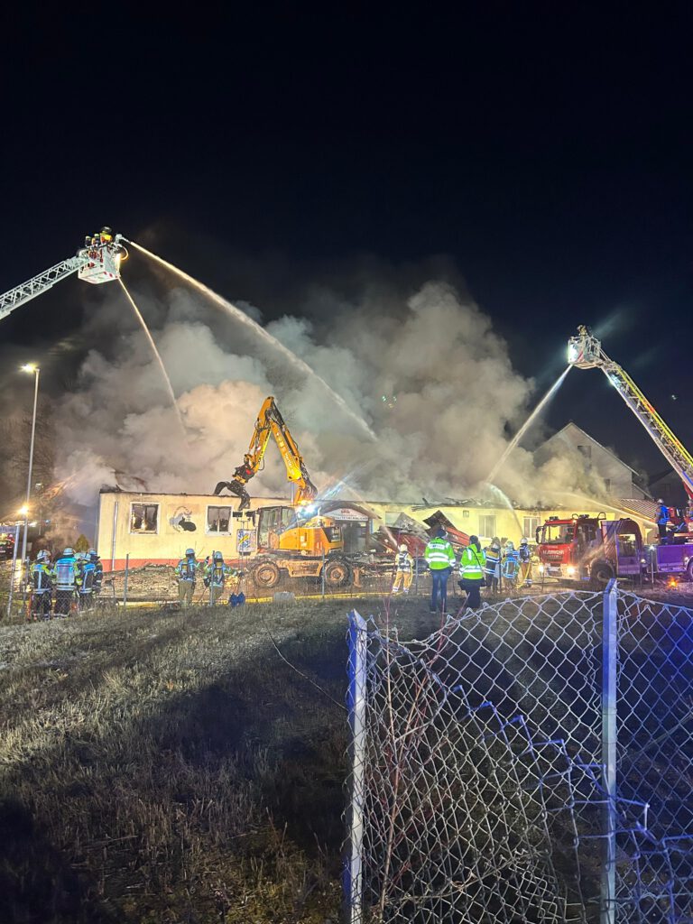 Ein Bagger konnte das, mittlerweile komplett brennenden Dach, abtragen und der Feuerwehr gelang es in zeitintensiver Arbeit die Reste des Gebäudes sowie den Schutt abzulöschen. Durch den umfangreichen Löscheinsatz konnte eine weitere Ausbreitung auf die Nachbarbebauung verhindert werden. Im Einsatzverlauf verletzte sich ein Feuerwehrkamerad leicht, weitere Personen blieben glücklicherweise unverletzt.