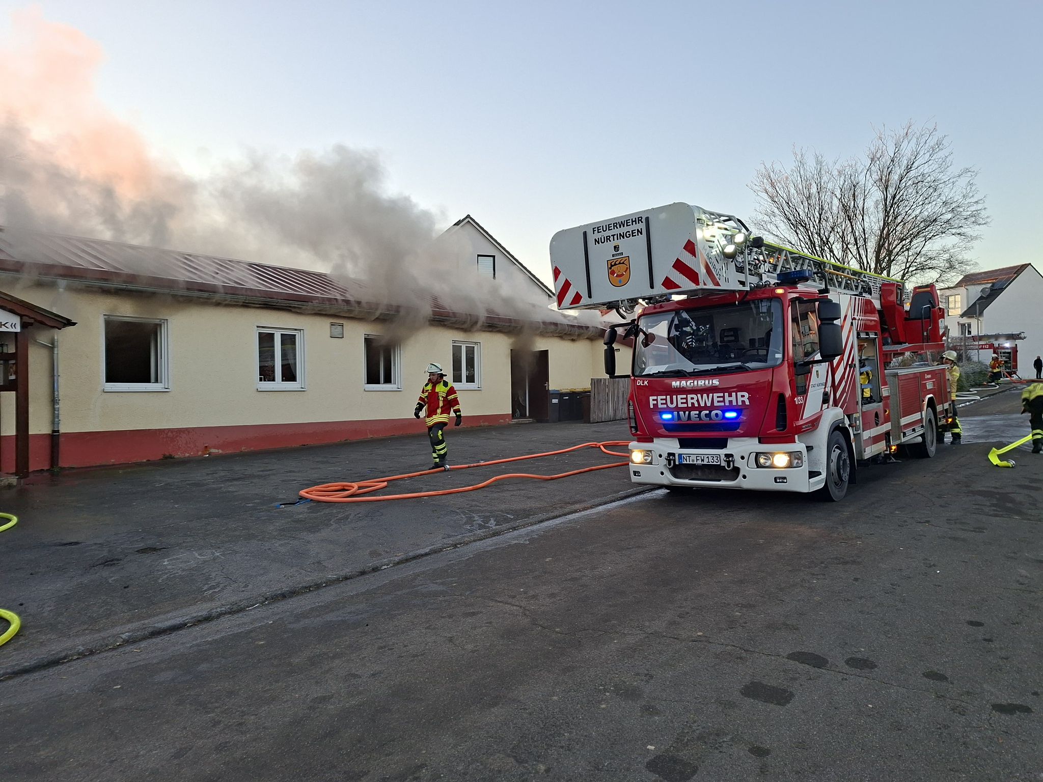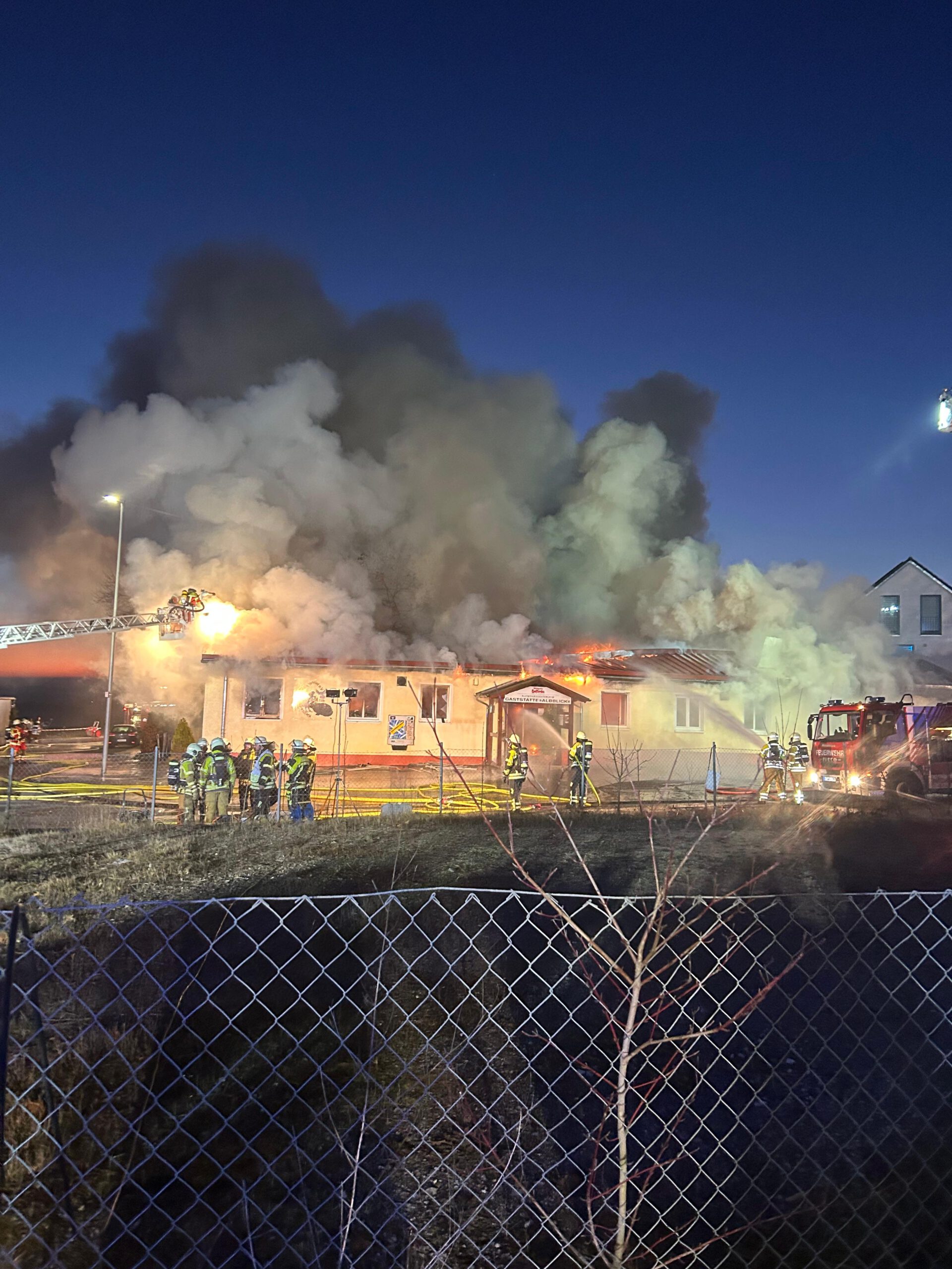 Der Brand breitete sich unglücklicherweise über das Dach des Gebäudes schnell aus. Die anwesende Drehleiter der Feuerwehr Filderstadt begann sofort mit der Öffnung des Daches. Nachdem sich der Brand weiter ausbreitete, wurden weitere Einsatzkräfte alarmiert. Aufgrund des starken Brandrauches wurde eine Warnung der Bevölkerung über die Warnapp Nina für den Ort Altenriet ausgegeben. Zur Verhinderung der weiteren Ausbreitung im Dach wurde eine 2. Drehleiter der Feuerwehr Nürtingen angefordert. Der Gerätewagen Atemschutz aus Kirchheim Teck wurde zur Versorgung der Einsatzkräfte mit Atemschutzgeräten nachgefordert. Das THW wurde zur Einschätzung der Gebäudesubstanz mit dem Baufachberater zur Einsatzstelle alarmiert. Aufgrund der absehbar längeren Einsatzdauer wurde eine Beleuchtungskomponente ebenfalls vom THW bereitgestellt.