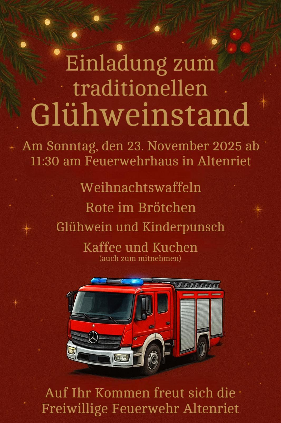 Auch in diesem Jahr freuen wir uns sehr darauf, Sie am 23.11.2025 zu uns in das Feuerwehrhaus in Altenriet, zum traditionellen Glühweinstand, einladen zu dürfen.